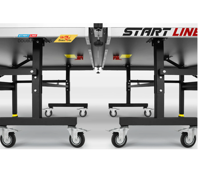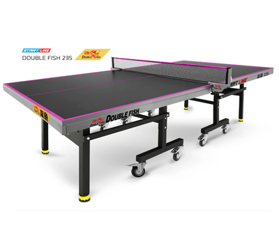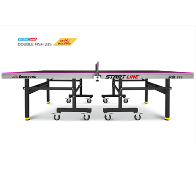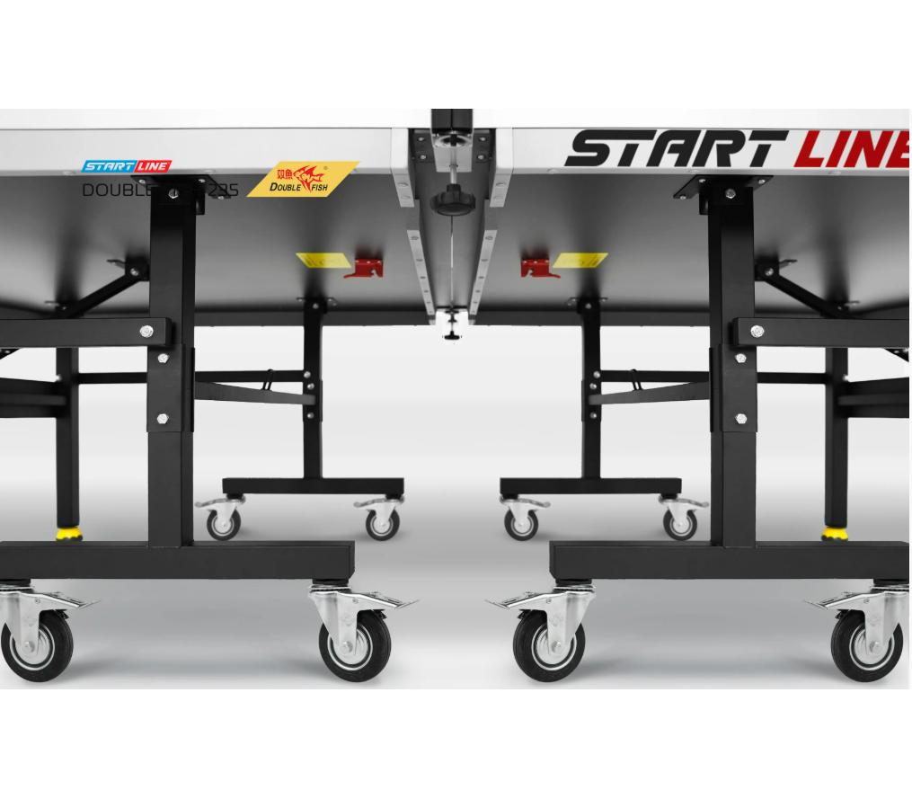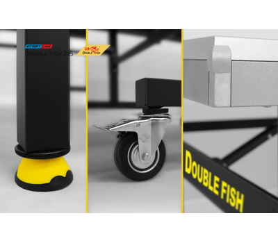 Легкая и удобная настройка рабочей позиции теннисного стола обеспечивается при помощи регулировки высоты стальных боковых опор и восьми поворотных колес. Надежная фиксация всех точек опоры позволяет выставить строго горизонтальный уровень стола на любой поверхности. Модель обладает исключительной устойчивостью и прочностью. Восемь обрезиненных маневренных транспортировочных колес диаметром 100 мм обеспечивают легкость перемещения стола. Колеса оснащены стопорами, которые задают жесткую фиксацию нужного положения и стабильность стола во время игры. Теннисный стол Double Fish 235 отличает комфортная и безопасная система складывания. Модель в сложенном виде очень компактна, что дает важные эксплуатационные преимущества: минимум места в положении хранения и удобство манипуляций при транспортировке. Уникальная конструкция позволяет установить стол в положение PlayBack для одиночной игры.