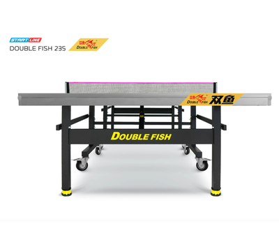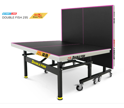 Double Fish 235 – теннисный стол от ведущего производителя оборудования для настольного тенниса. Размеры теннисного стола в рабочем положении соответствуют стандарту ITTF: 274 см в длину, 152,5 см в ширину, 76 см в высоту. Столешница выполнена из МДФ толщиной 25 мм с многослойной покраской. Такая комбинация материалов не только защищает стол от повреждений и трещин, но и гарантирует предсказуемый отскок до 23 см при броске с высоты 30 см. По периметру столешница обрамлена кантом 50х20 мм, который придает игровому полю дополнительную жёсткость и стабильность во время игры, а также защищает края от механического воздействия.