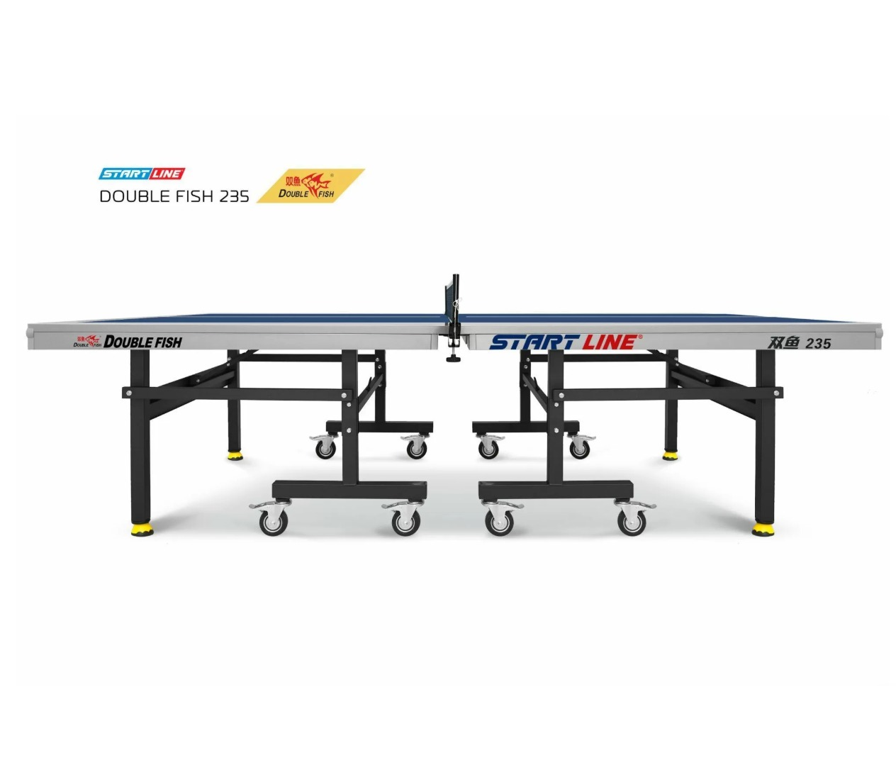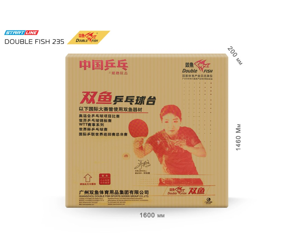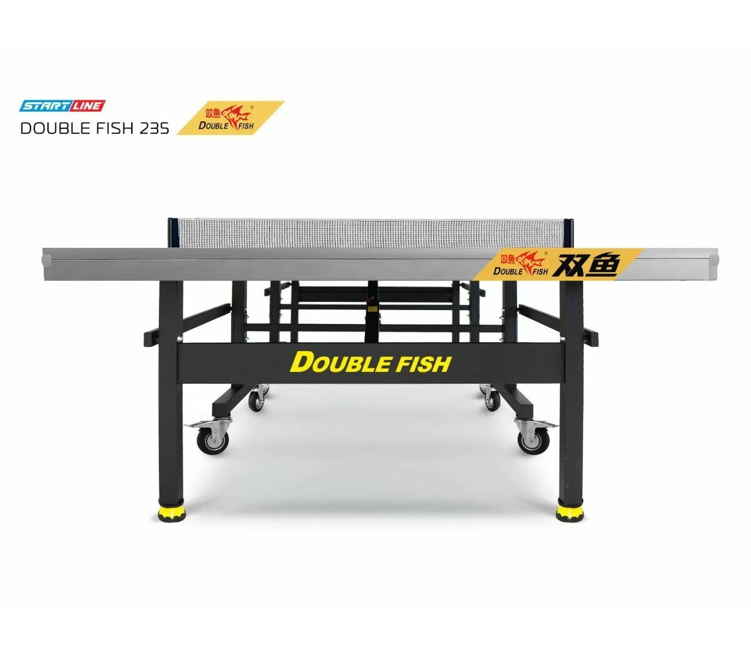 Double Fish 235 – теннисный стол от ведущего производителя оборудования для настольного тенниса. Размеры теннисного стола в рабочем положении соответствуют стандарту ITTF: 274 см в длину, 152,5 см в ширину, 76 см в высоту. Столешница выполнена из МДФ толщиной 25 мм с многослойной покраской. Такая комбинация материалов не только защищает стол от повреждений и трещин, но и гарантирует предсказуемый отскок до 23 см при броске с высоты 30 см. По периметру столешница обрамлена кантом 50х20 мм, который придает игровому полю дополнительную жёсткость и стабильность во время игры, а также защищает края от механического воздействия.