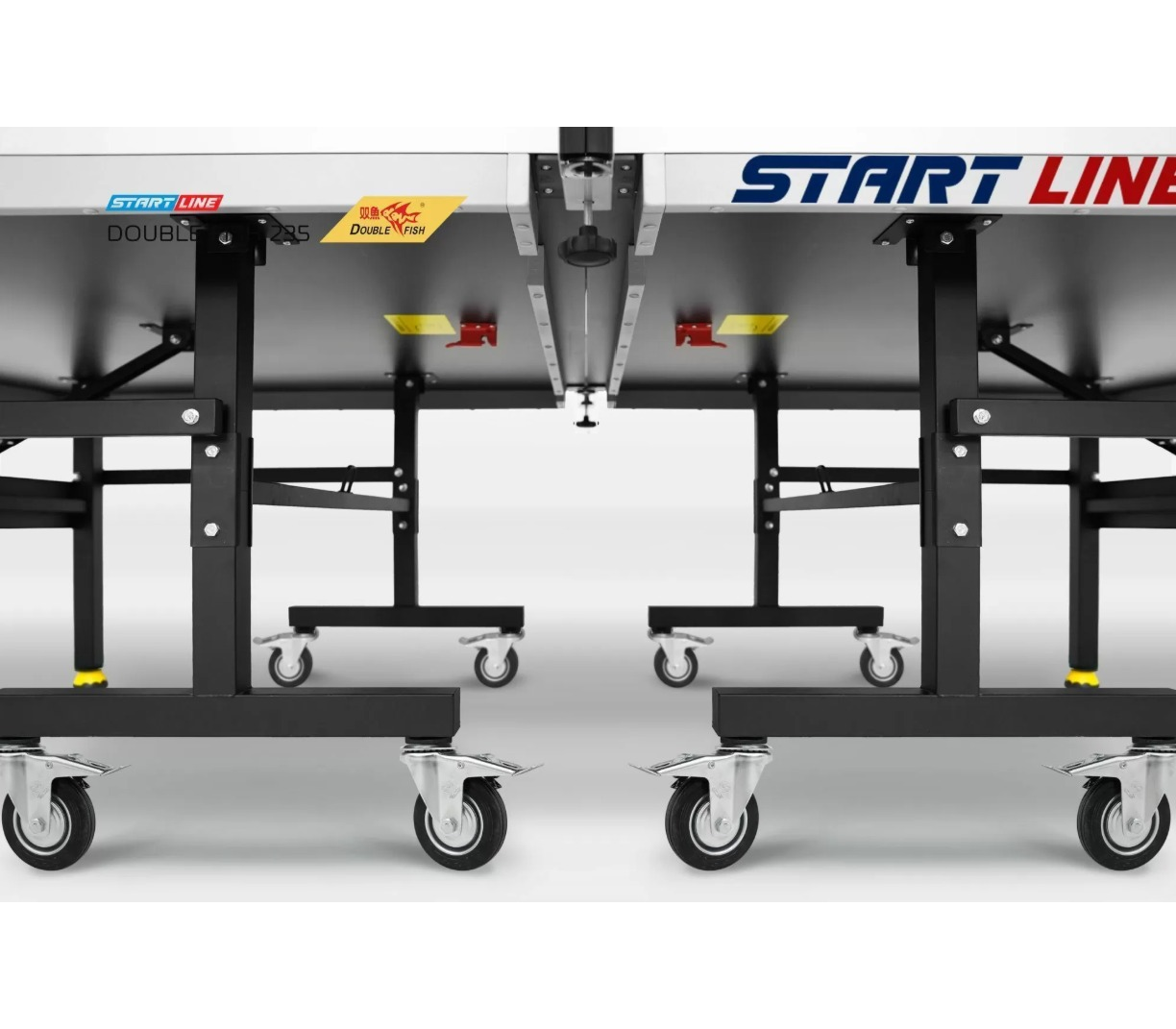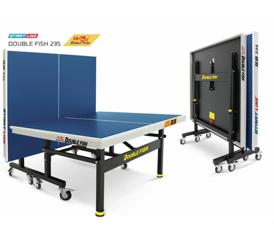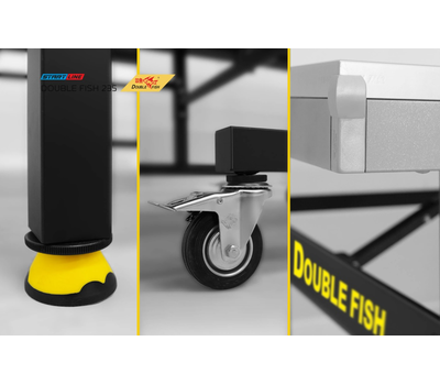 Легкая и удобная настройка рабочей позиции теннисного стола обеспечивается при помощи регулировки высоты стальных боковых опор и восьми поворотных колес. Надежная фиксация всех точек опоры позволяет выставить строго горизонтальный уровень стола на любой поверхности. Модель обладает исключительной устойчивостью и прочностью. Восемь обрезиненных маневренных транспортировочных колес диаметром 100 мм обеспечивают легкость перемещения стола. Колеса оснащены стопорами, которые задают жесткую фиксацию нужного положения и стабильность стола во время игры. Теннисный стол Double Fish 235 отличает комфортная и безопасная система складывания. Модель в сложенном виде очень компактна, что дает важные эксплуатационные преимущества: минимум места в положении хранения и удобство манипуляций при транспортировке. Уникальная конструкция позволяет установить стол в положение PlayBack для одиночной игры.